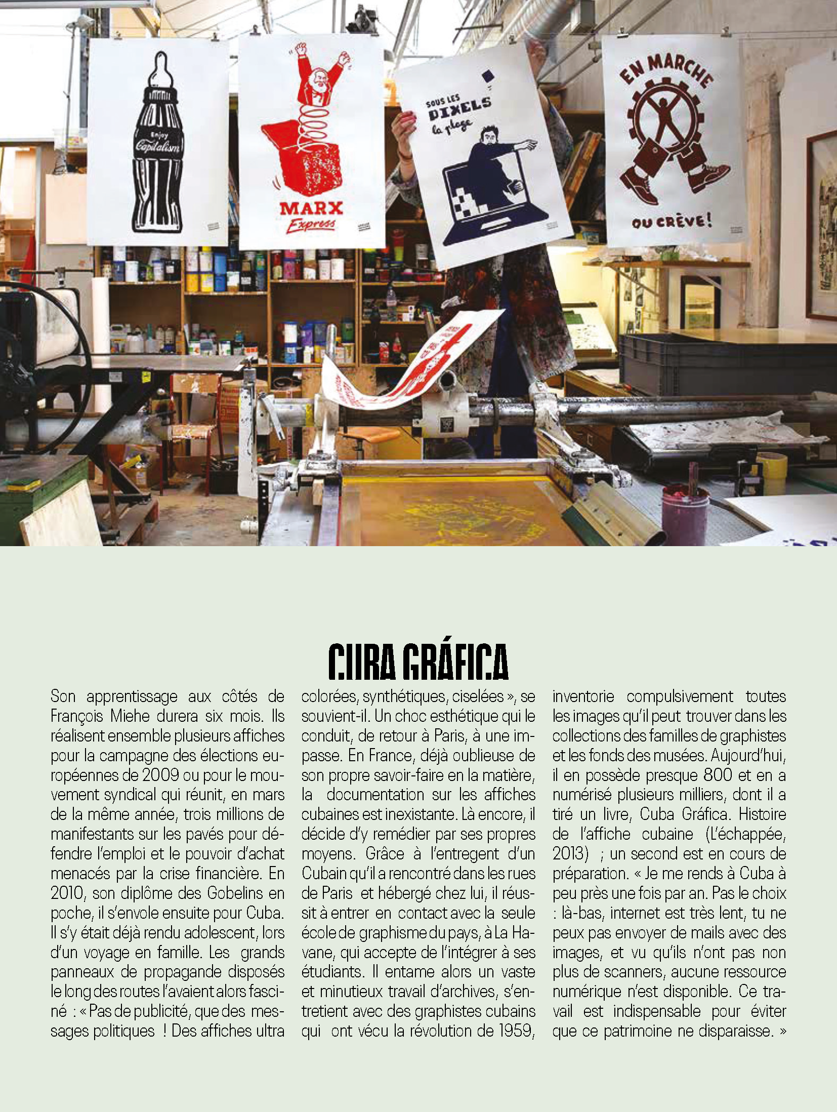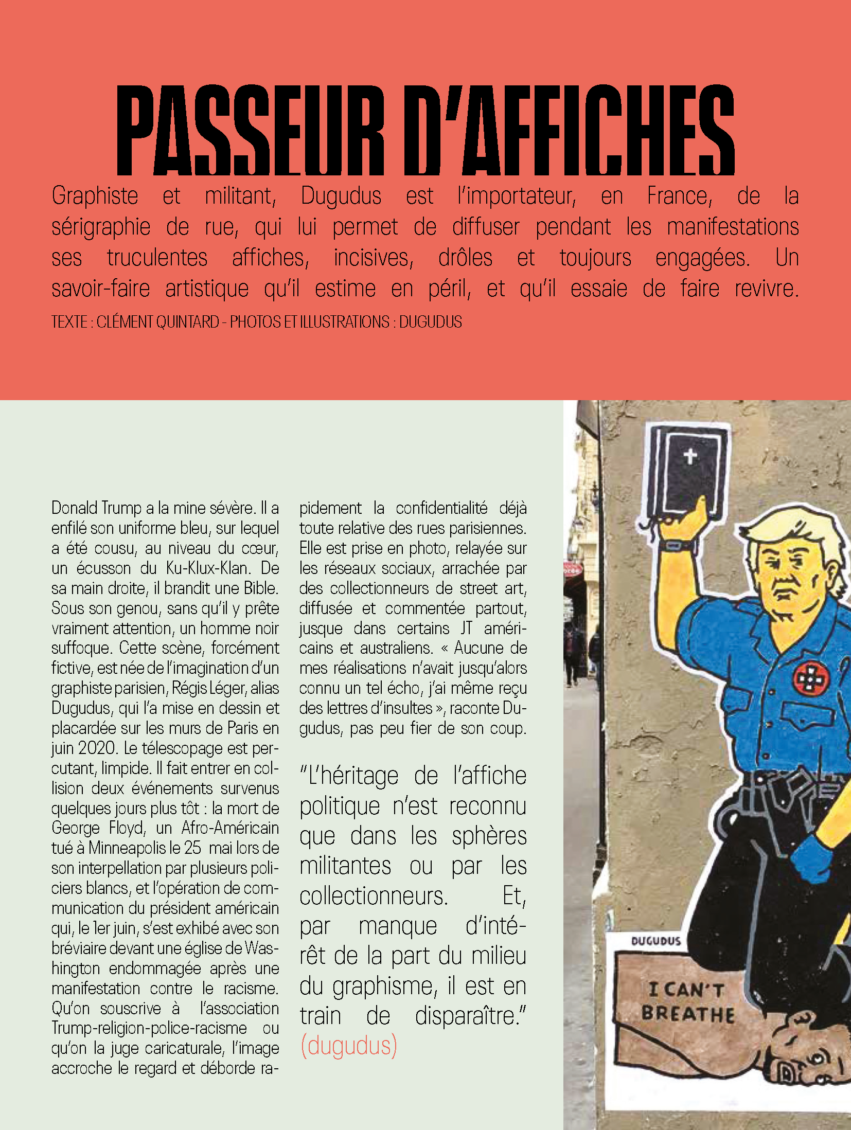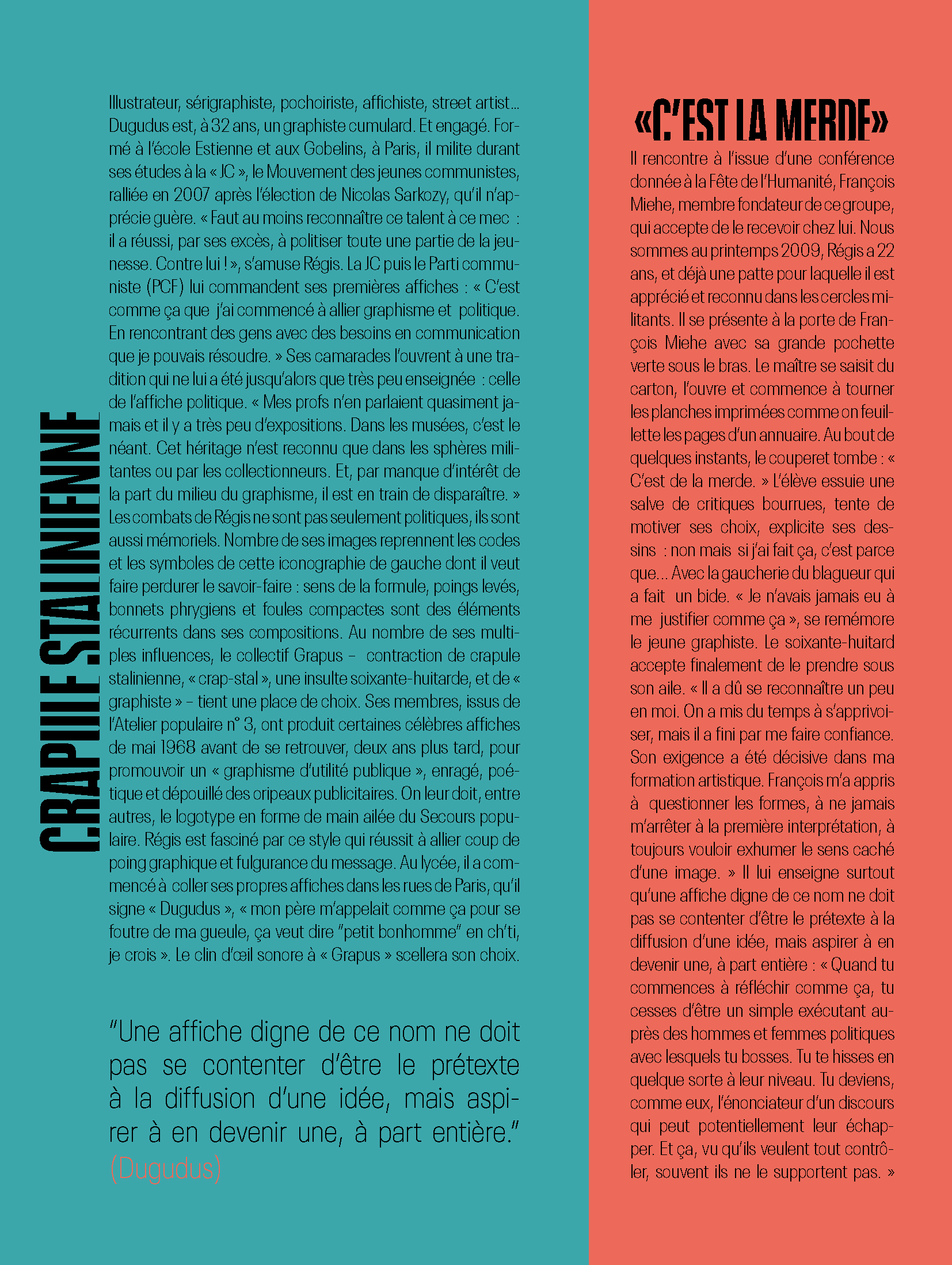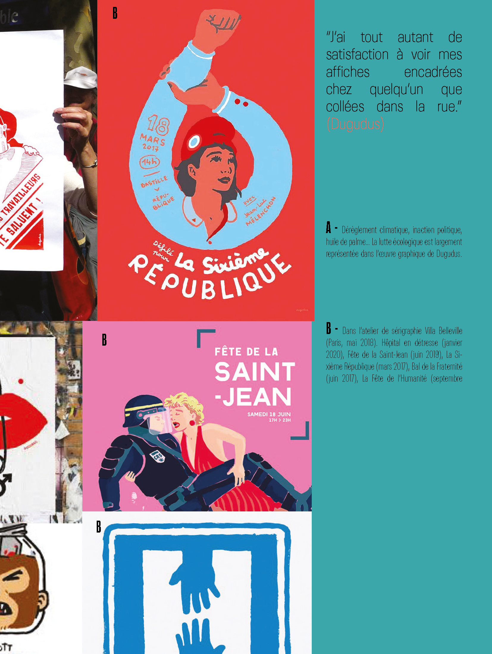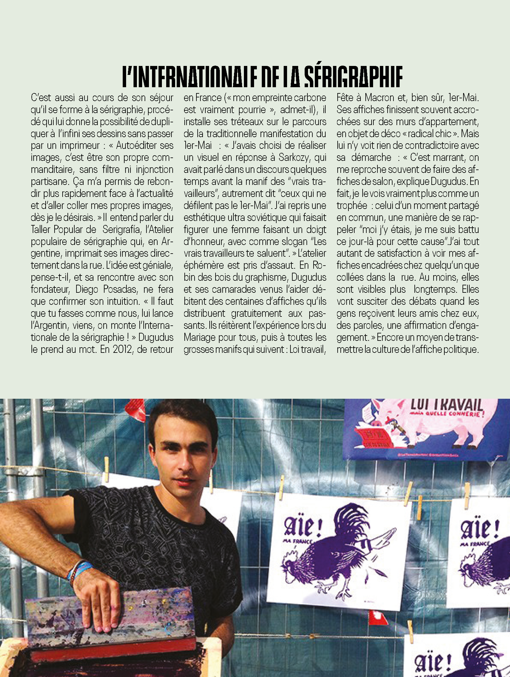 Projet d'école, mise en page d'un article paru dans le numéro 42 du magazine Socialter. L'article intitulé "DUGUDUS : PASSEUR D'AFFICHE", parle de Dugudus, un graphiste et militant qui a importé la sérigraphie de rue en France.